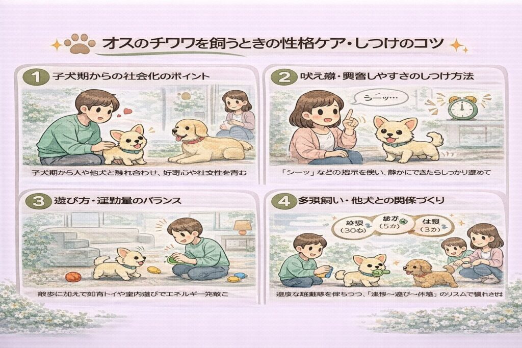 チワワの性格を安定させるには、生後3〜12週の社会化期に他犬や人との接触を増やすことが重要です。