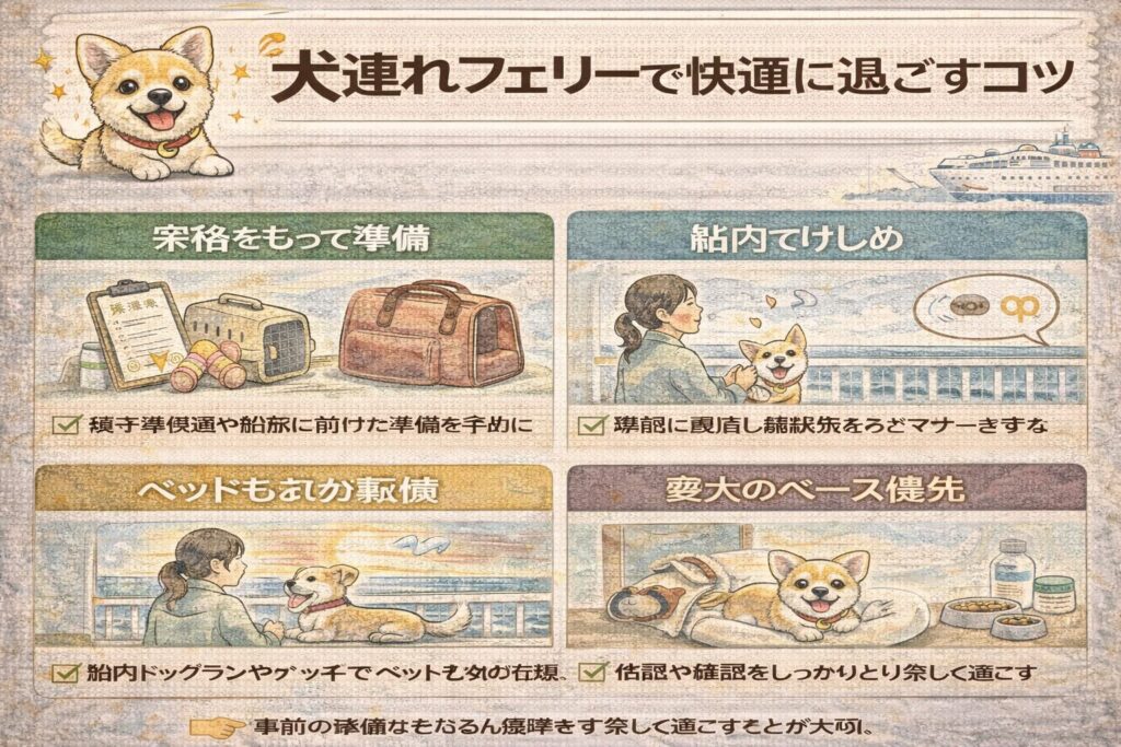 犬連れフェリーは、事前の準備と基本的なマナー・健康管理・安全対策をしっかり整えることで、ワンちゃんとの快適な船旅が実現できます。