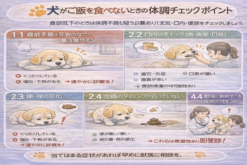 犬がご飯を拒否する行動は以下のようなものがあります。