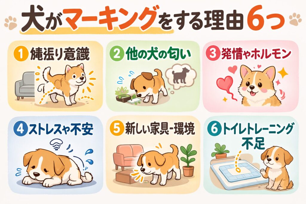 犬のマーキングは、縄張り意識やストレスなどが原因で起こることが多いです。