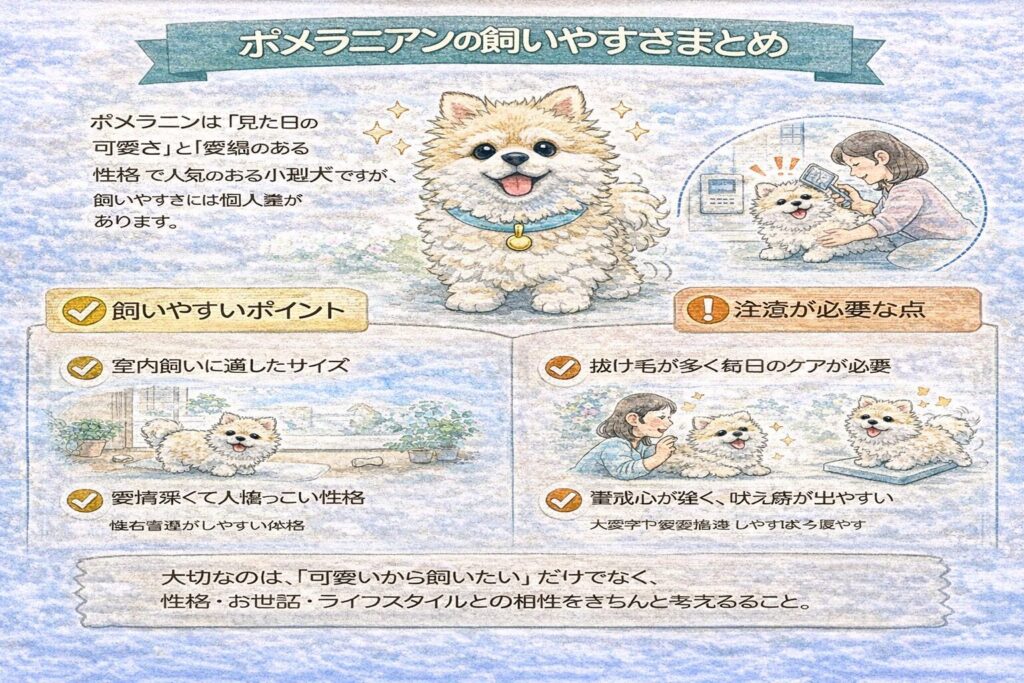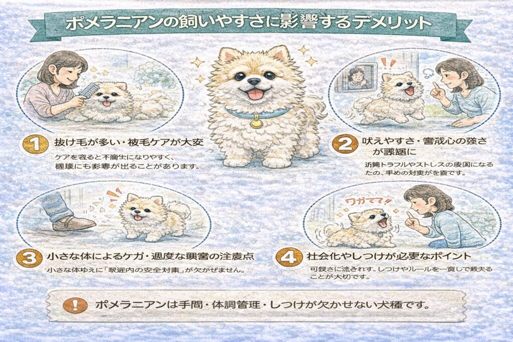 ポメラニアンは飼いやすいポイントも多い一方で、性格やケアにおいて注意すべき点もある犬種です。