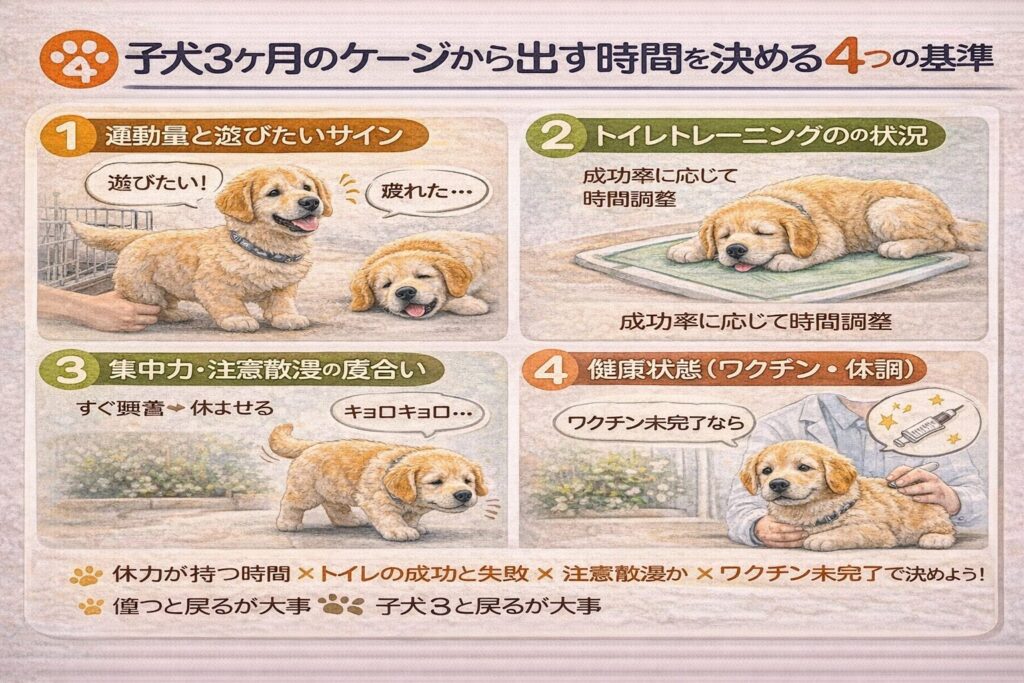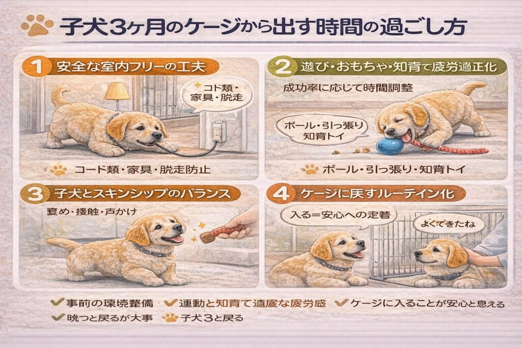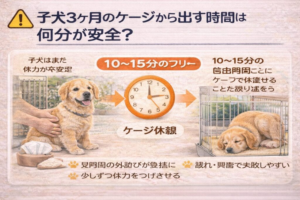 子犬3ヶ月の段階では、ケージから出す時間は、短く・こまめに・安全第一で進めるのが基本です。