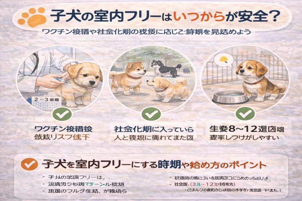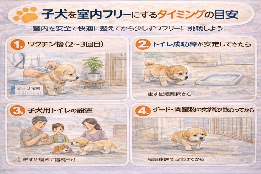 子犬の室内フリーを始める目安は、一般的に次のような条件が揃ったときです。