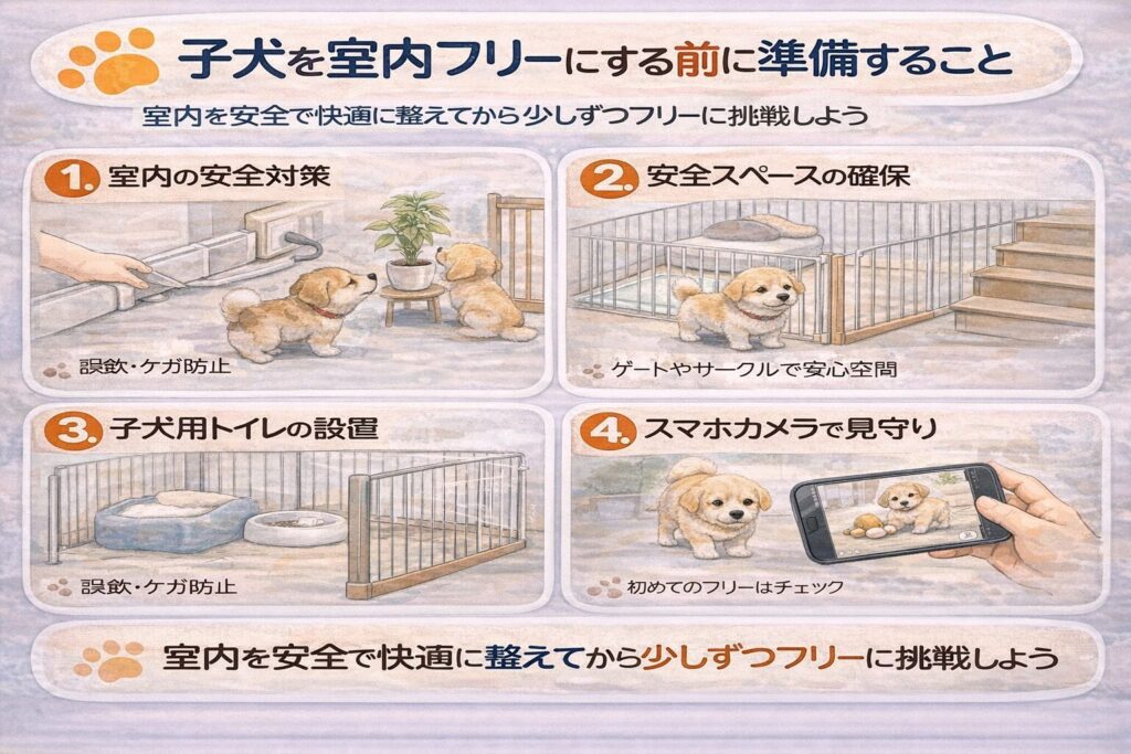 子犬の室内フリー(家の中を自由に過ごすこと)は、ただ自由にするだけではなく、しつけ・安全対策・タイミングを見極めることが大切です。